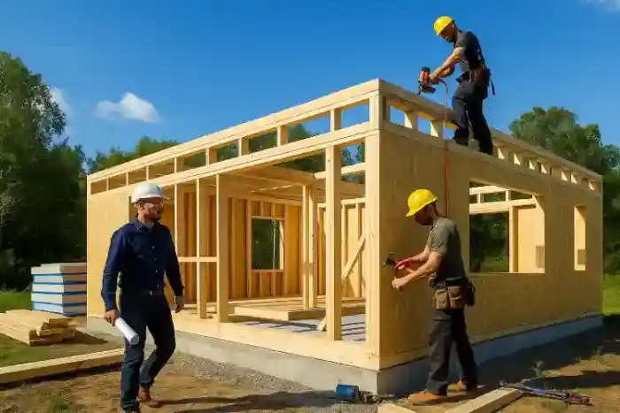 Теперь начинается основное строительство. 🛠️ Сначала возводится фундамент (чаще всего свайный или ленточный), затем собирается деревянный или металлический каркас. После этого монтируются перекрытия, кровля, выполняется утепление минеральной ватой и прокладываются коммуникации: электрика, водопровод, канализация.